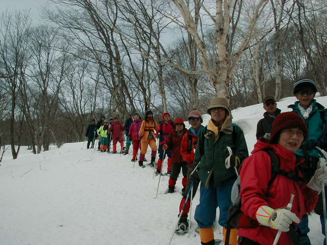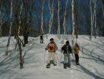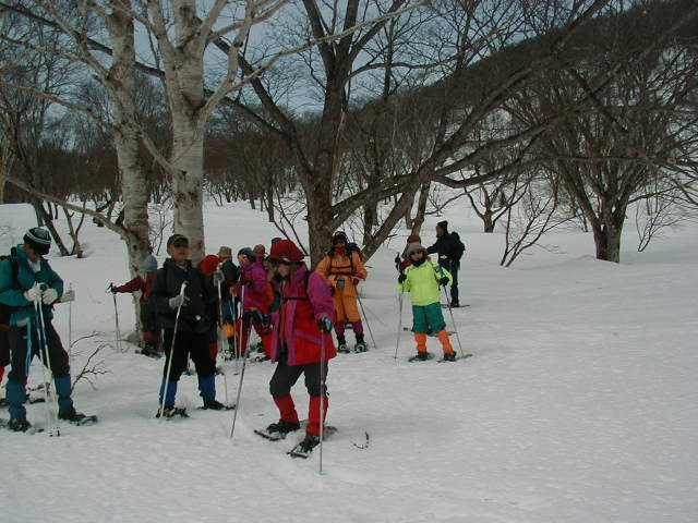 翌日は前線一過、良く晴れたため、池の平のリフトを使って中腹まで行き、赤倉の方へ自然の森を歩いて下るコースを歩いた。見晴らしも良く、近くには斑尾山と黒姫山、野尻湖、遠くには志賀高原や菅平の山々、はるか遠くには越後駒が岳を中心とした越後三山まで真っ白い姿を見ることができた。 途中にはダケカンバ、ウダイカンバ、ブナ、キハダなどの大木が点在し、この時期ならでわの雪の自然を味わうことができた。 駒村さんをはじめ上尾ビスタリークラブの皆さんは皆元気で、朗らかで、また、私のつたない説明を一生懸命聞いていただき、楽しいトレッキングをすることができた。 トレッキング終了後、皆さんは蕎麦を食べに行かれ、その後温泉につかって帰路につかれた。 ありがとうございました。また、登山やトレッキングにお越しください。お待ちしております。 |