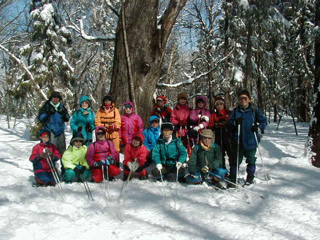 | 3/17-18(金・土)雪・曇・晴 | 埼玉の上尾ビスターリ倶楽部というご年配の方を中心にした歩く会のメンバーの方々が1泊泊まりでスノーシューしにいらっしゃった。駒村さんをリーダーとする男性5人、女性13人、計18人のメンバー。 17日は前線通過の影響で午前中は大荒れで、午後から戸隠にトレッキングに行くことになった。 最初は降ったり止んだりの天気だったが、そのうちに晴れ間が出てきて、素晴らしい戸隠の自然を味わうことができた。 奥社までの参道の両側には、たくさんの巨木が点在している。ここの社寺林は江戸時代初期から伐採が禁止されていたため樹齢数百年の巨木がたくさん残っている。ウラジロモミ、イチイ、ハルニレ、ミズナラ、ダケカンバ、ウダイカンバ、ブナなどが中心でグリーン期には近づけない木にもこの時期だけ近づくことができる。大きな木には触ってもらい雪の自然の醍醐味を味わってもらった。